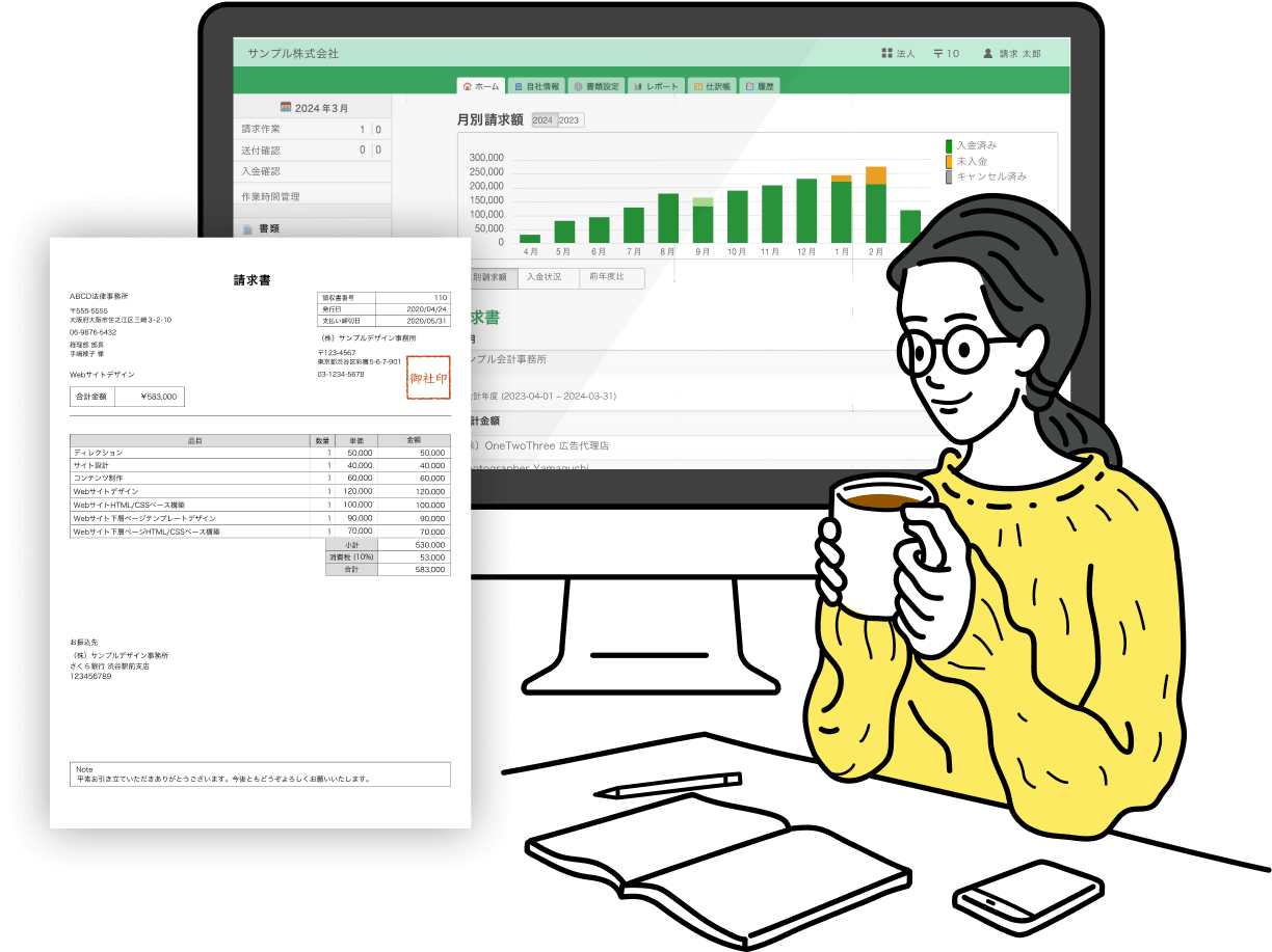 請求書を作成するだけで、売上高や売掛金などのデータから自動で表やグラフを作成。