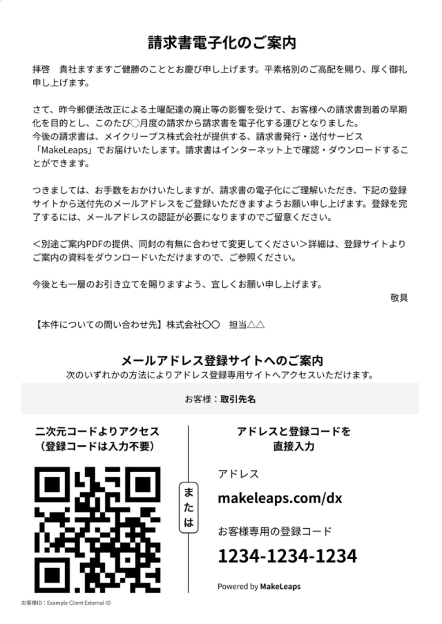 郵送代行で書類を送付する際に自動で案内文書が同封され、取引先は紙で受け取った案内文書から登録ページへアクセスします。