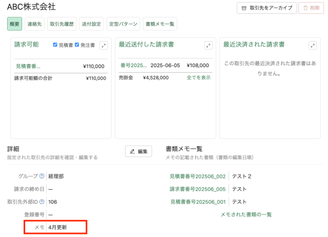取引先のメモを登録できるようになりました