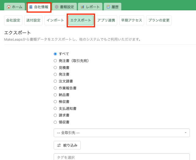 「自社情報」タブ > 「エクスポート」と進むと、書類のエクスポート画面が開きます。