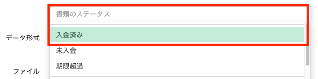 上記からさらに入金済みのものだけをエクスポートしたい場合は、「書類のステータス」から「入金済み」を指定すると、対象の月に発行した入金済みの書類だけをエクスポートできます。