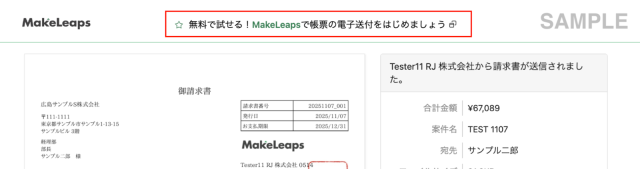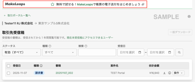 書類の受け取り画面、取引先受信箱のヘッダーへMakeLeapsのご案内文を表示します。
