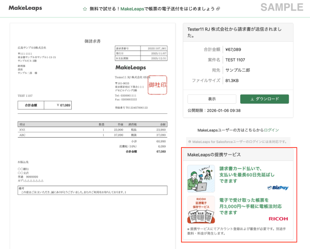 書類を確認・ダウンロードする受け取り画面の右下に「MakeLeapsの提携サービス」のご案内を表示します。(セキュア送信・取引先受信箱共通)